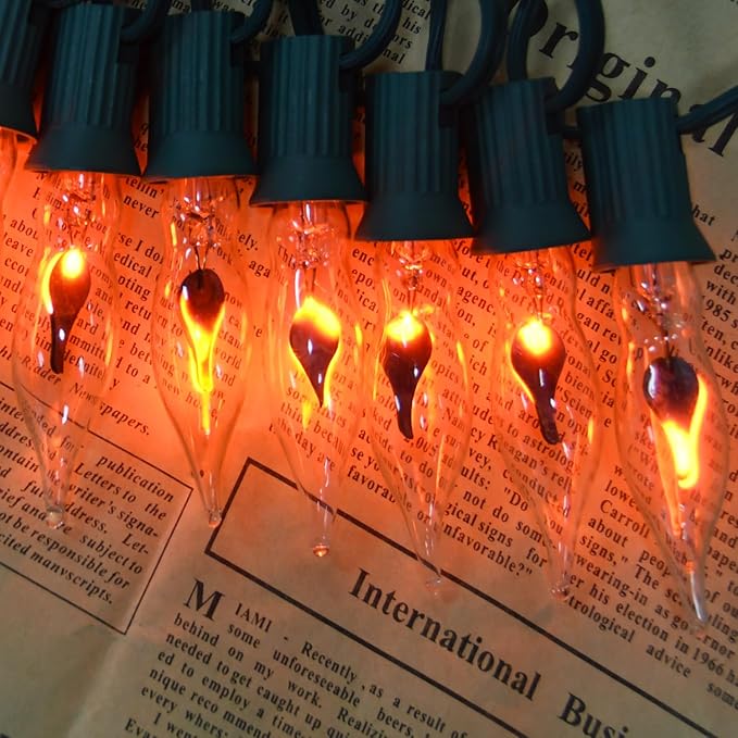 • 🔥【Clear Flame Lights Specifications】: This unique fake flame Christmas lights string is 12.8 feet in total length with 39.5 inches / 1 meter male plug leads, 12 inches spacing between bulbs, and 6 inches female plug leads. Each string of flame lights has a total of 10 clear glass flame bulbs and 2 spare C18 clear flame bulbs, 1 watt, 120 volts. Flashing Christmas lights provide 2000+ hours of illumination and are safe and durable, eliminating the need for frequent bulb changes.
