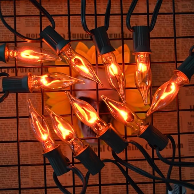 • 🔥【Realistic Christmas Flame String Lights】: 12.8 Feet 10 Lights C7 Christmas lights Flickering Flame String Lights comes with 12pcs 1W clear flame bulbs (2 spare bulbs), fit for C7/E12 screw base,green wire. The flame lights bulbs seem to really burn when energized, with realistic flame flickering effect, like dancing little firemen, mysterious and charming, add a charming and fun glow to your Christmas decorations.