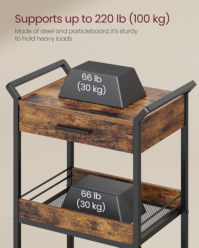 VASAGLE Storage Cart, 3-Tier Rolling Utility Cart with Table Top, Handles, 4 Lockable Casters, Top Drawer, Mesh Shelves, for Kitchen, Bathroom, Bedroom, Rustic Brown and Ink Black ULRC048K01