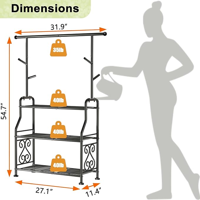 • 【🌿 Multi-Functional Plant Display】Showcase 14+ plants across 3 spacious tiers (27.1" x 11.4"W per tier). Side guardrails prevent pot slippage + 5 integrated hooks for hanging plants/tools. Ideal for climbing plants with vertical pole design.