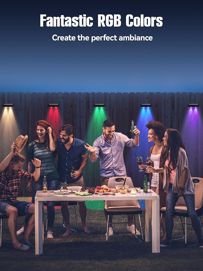 • 【10 Lighting Colors & 12 Modes Solar Fence Lights】Decorate your outdoor areas with our RGB fence solar lights! With 10 vibrant colors and 12 lighting modes, you can easily create the perfect atmosphere. Warm White are ideal for everyday lighting, while the RGB modes add lively colors, perfect for festive decorations or special occasions. These fence lights are great for fence, patio, backyard, garden, stair, and deck, and are eco-friendly, adding a delightful touch to your outdoor decor