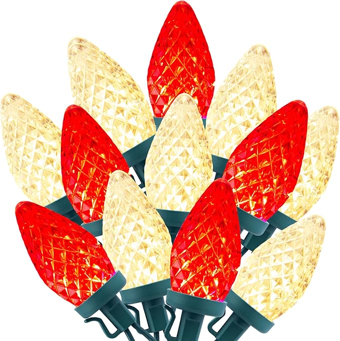 • 【 Brilliantly Bright Glow 】- These Christmas light strings feature large, faceted C9 bulbs made from durable polycarbonate, offering good brightness, colour saturation, ruggedness and reliability. Built-in SMD LED creates vivid lighting effects; the diamond facet hole design prevents stagnant water. Bulbs with vibrant colors will never fade, chip or crack