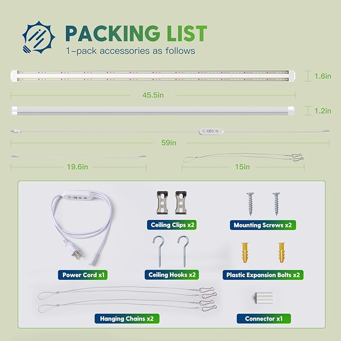 • Easy Installation: Two installation ways—Hanging or Mounting, with included wire rope hooks, clips, connectors, hooks and screws, you could install the plant grow lights indoors by yourself in minutes