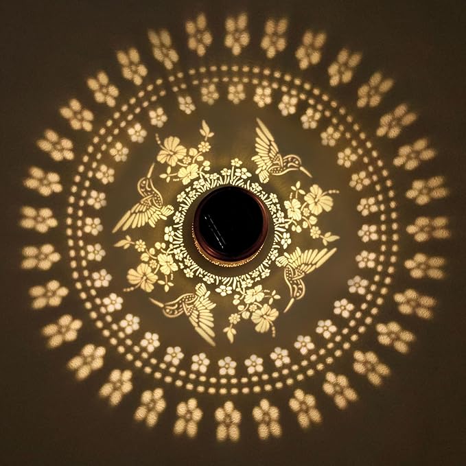 • 【Perfect Garden Decorative】- Hummingbird solar lanterns adopts hollow out design and butterfly pattern. Solar lanterns could project beautiful patterns, creating a gorgeous and warm atmosphere. Perfect for decorations for garden,patio,lawn,backyards,porch and many other scenes.When lit at night, adding a touch of color to your garden.Size: 7"H x 4.5"W x 4.5"L