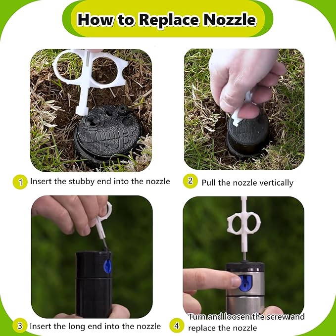 • Easy to Use - You can put plastic end inside the raised arrow, make a quarter turn and simply pull up to replace sprinkler nozzle; Insert the plastic end into corresponding slot to adjust the spray angle; Insert the metal end inside the raised arrow to fix the nozzle or adjust the spray distance