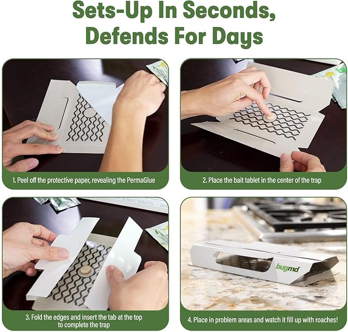 • Easy, Fast Setup Cockroach Trap: Pre-folded glue traps for a quick, easy, under-a-minute setup. Simply remove the adhesive covering, place the bait, fold the trap, and watch bugs collect inside