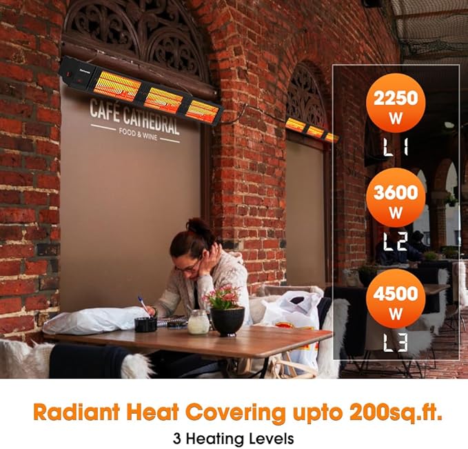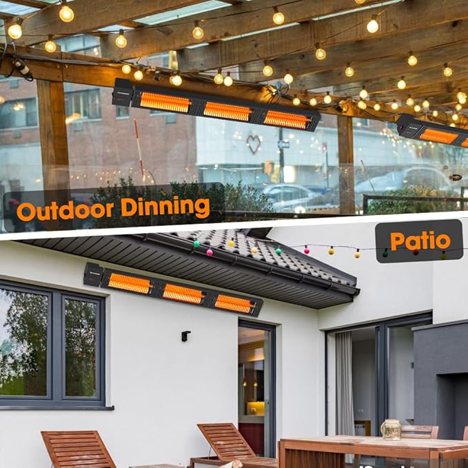 • 3 SECONDS INSTANT HEAT - This infrared patio heater with carbon fiber heating tube delivers instant powerful heat, only warming people and solid objects directly and unaffected by wind, providing you with maximum comfort for your winter activity outdoor, perfect addition to your patio, deck, garage or workspace
