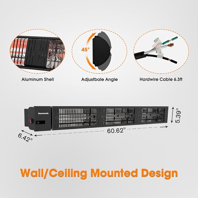 • 170 SQUARE FOOT SPACE - Powerful 4500W output, producing heat to cover up to 200 sq.ft. Recommended least mounting height 7.88 feet. Must be hardwired to dedicated circuit breaker, including a 6.3 feet cable cord requiring wire connection