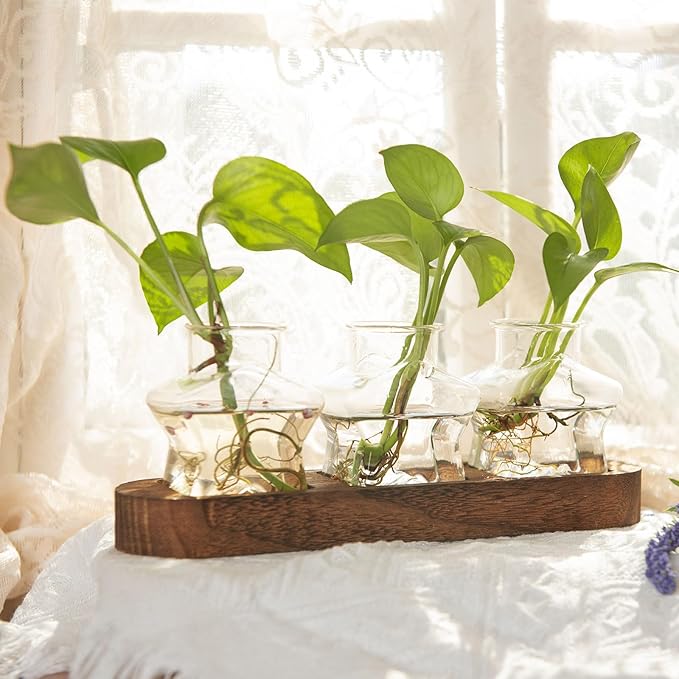 • HIGH QUALITY DESKTOP HYDROPONTIC CONTAINERS: Hydroponic glass vase has a rounded mouth, comfortable to touch and does not hurt your hands. The wooden plant stand is made of high quality tung wood, the bottom of the star-shaped plant propagation vase fits into the wooden tray groove, placing it smoothly and using it with peace of mind. Plant propagation vase is made of high boron glass to create a translucent and bright, sparkling in the sunlight, good-looking and charming, is a romantic life ritual, create a fresh and natural space decorative goodies.