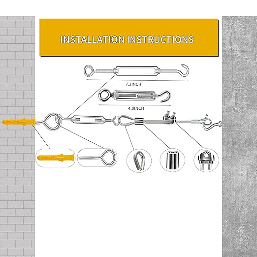 • 【Easy to install】: spring snap hooks for quick and secure connections,eye hooks with screws and wall anchors for a variety of anchoring options.8 wire rope clips that are designed to securely fasten the cable at any point along its length.10 aluminum sleeves and 10 wire rope thimbles to provide a smooth and snag-free cable path.5 adjustable turnbuckles included,you have the flexibility to make precise adjustments to the tension of your wire rope setup.