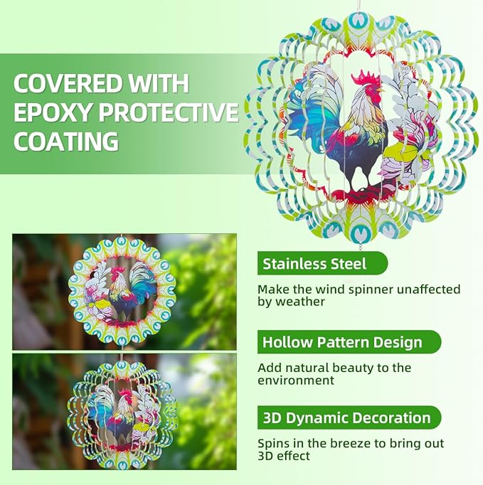 • 【Durable Stainless Steel Wind Spinner】The 30cm/12-inch 3D rooster wind spinner decoration is made of solid stainless steel material and is formed into a bright and shiny shape through laser cutting technology. The surface is coated with an epoxy protective coating, which is waterproof and rust-proof. Whether it is a blizzard, strong wind or scorching heat, the FACIACC wind sculptures is durable and will not rust, fade or fall off.