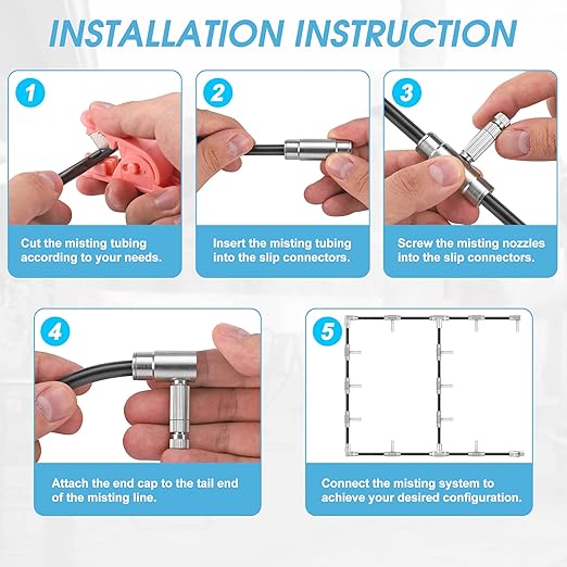 • 【Easy to Install】: The slip lock quick pushing mechanism makes easy installation and disassembly. Just insert the 3/8 inch Nylon PE PU tubing into the straight slip connectors, screw the mister nozzles into the straight slip connectors, and then attach the end cap to the tail end of tubing. During the installation process, the 3 way slip connectors tees can be used to connect tubing from different directions, while the elbow slip connectors can be used to connect different tubing at the corner.