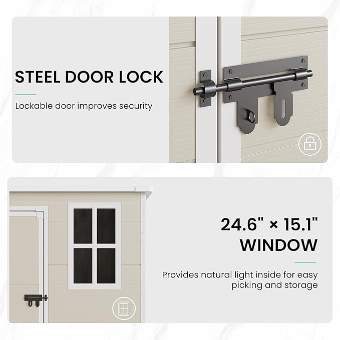 • STURDY FLOOR AND WINDOW: Equipped with a sturdy floor, our outdoor storage cabinet effectively prevents moisture from seeping into the structure, safeguarding your belongings from potential damage caused by dampness, mold, or rot. The window design facilitates ventilation and natural light. It allows the visibility of tools from the outside and enhances the aesthetics of the shed