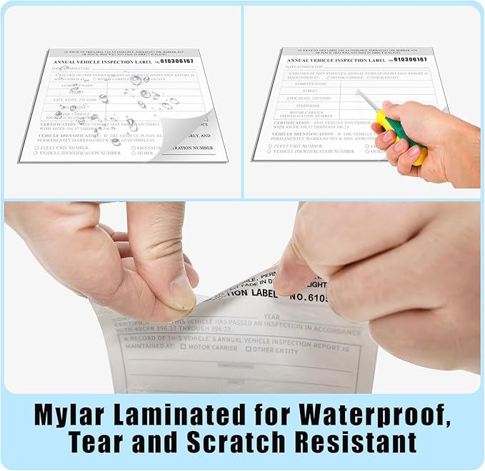 • Label Durability: The durable white 2-ply vinly vehicle inspection labels with mylar lamination offer resistance to heat, tear, and puncture. These annual vehicle inspection stickers are easy to apply, write on, and long-lasting. Measuring 5" x 4", they are sequentially numbered for convenient alignment with inspection forms.