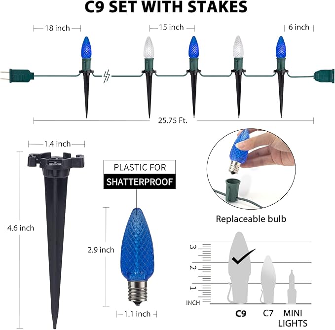 • 2024 Strawberry C9 Christmas Lights Outdoor: 25.7 feet C9 Christmas pathway lights with 20 C9 strawberry bulbs. 15 inches light spacing, 4.6 inches pathway markers, 20 sturdy stakes, E17 socket compatible, red and white lighting effect, plug in and enjoy it. This christmas outside decorations for yard will be great for your pathway, garden, courtyard, holiday decor