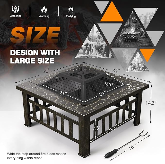 • [ Reliable Security ]: Firepit table features square design with sturdy legs for stability, while the mesh spark screen and poker provided effectively prevent sparks from flying and safely move the grill.