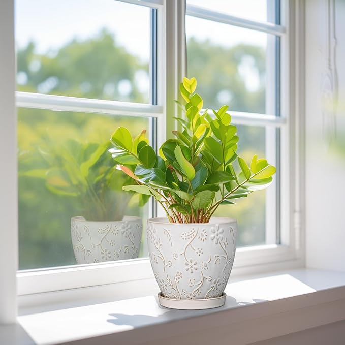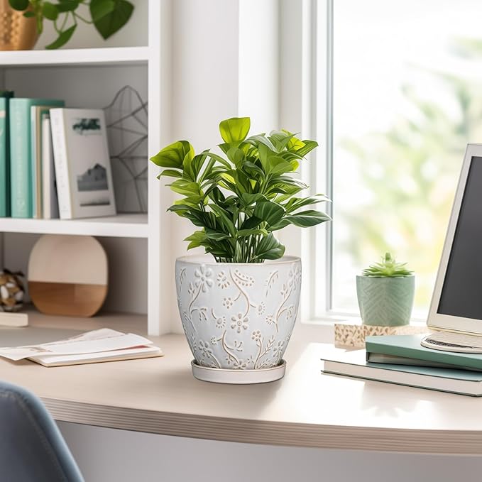 • Stylish Appearance: Our ceramic plant pot has a white main colour, a beautiful embossed petal and leaf pattern on the surface, elegant appearance making it ideal for home decor, garden decor and office decor