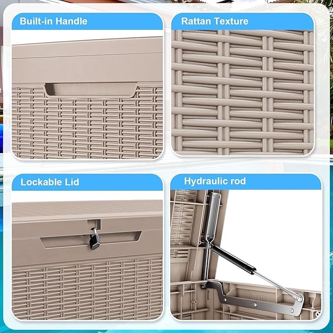 • SAFETY & LOCKABLE DESIGN - Equipped with a hydraulic rod, this storage box ensures smooth and safe lid operation, preventing accidental pinching. The built-in lockable design provides an additional layer of security, keeping your outdoor valuables safe and protected.