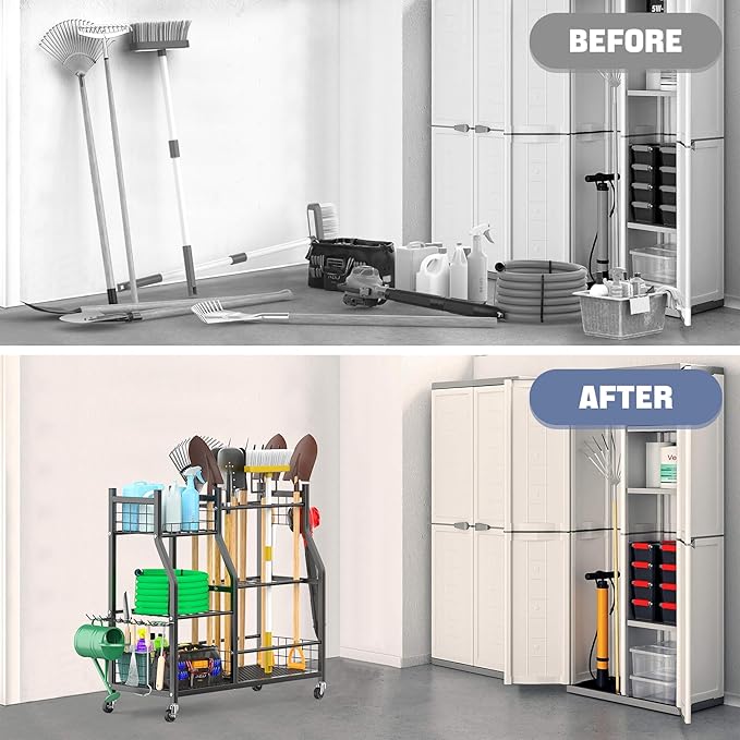 • Portable Design with Wheels: Easily move garden tools around your yard or garage with this wheeled organizer. Ideal for solid floors, the wheels offer flexibility that wall-mounted racks lack, allowing you to roll the cart close to your work area or outside