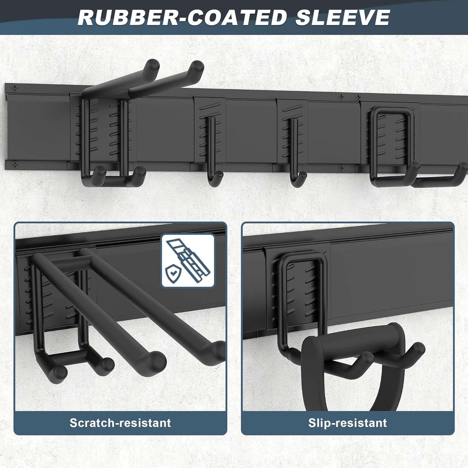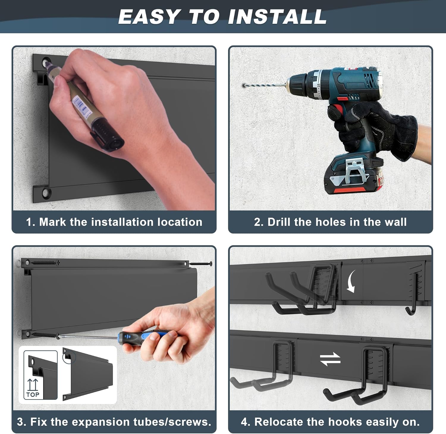 • VERSATILE AND SPACIOUS: Garage tool organizer storage systerm includes 15 different hooks to store all your tools like shovels, brooms, bikes, bags, towels,etc. Total length is 119 inches, suitable for garage, basement, shed,etc