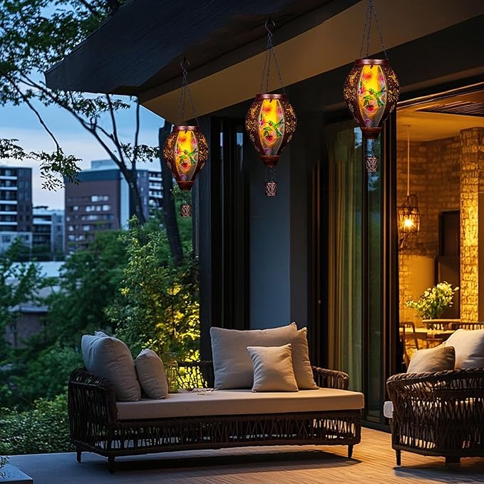 • 【Hot Air Balloon Solar Lantern】The solar lanterns outdoor waterproof is made of glass and metal, with hummingbird patterns on the glass and flower hollow patterns on the metal. The unique hot air balloon design coupled with flickering flame light makes this outdoor lantern rise like a hot air balloon as night falls, creating a warm and beautiful atmosphere for your garden