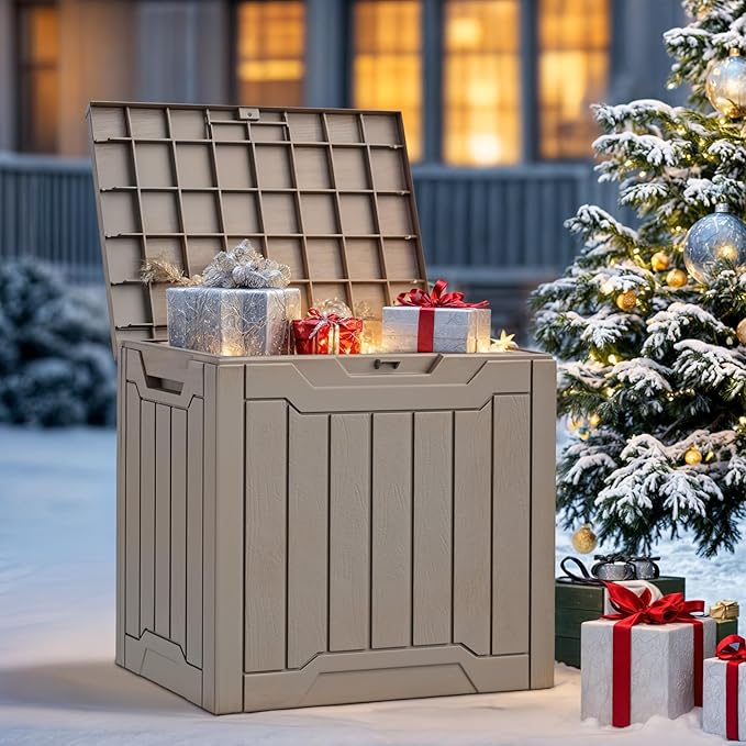 • Multipurpose Use: Our 30-gallon deck box features an attractive wood-like texture, making it ideal for storing outdoor supplies, pool accessories, and beach towels with natural appeal; It also serves as a storage bench, side table, or patio table