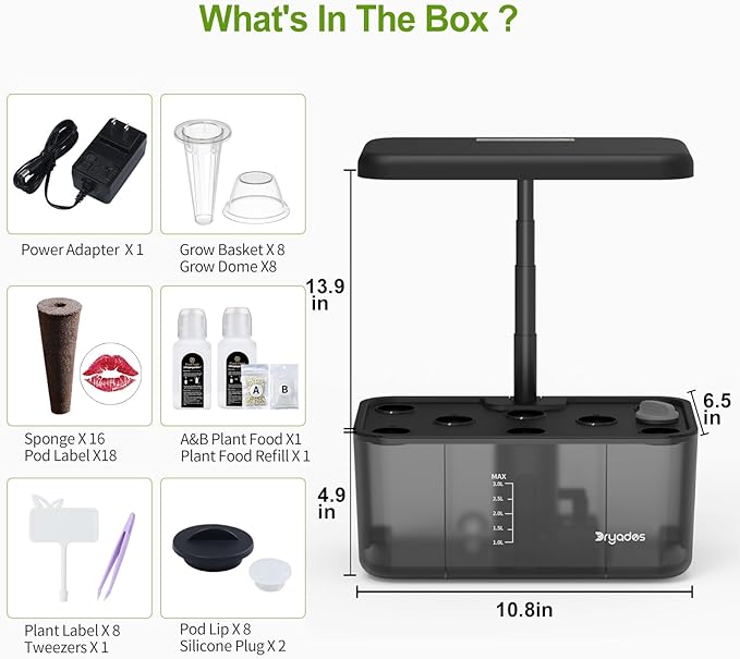 • 【What You Can Get 】Planting Machine x1(seeds not included),Power Adapter x1,Grow Basket x8, Sponge x16 ,A&B Plant Food x1,Plant Food Refill x1, Plant Label x8 , Grow Dome x8 ,Pod Label x8 ,User Manual x1 ,Tweezers x1 ,Pod Lip x8 ,Silicone Plug x2.