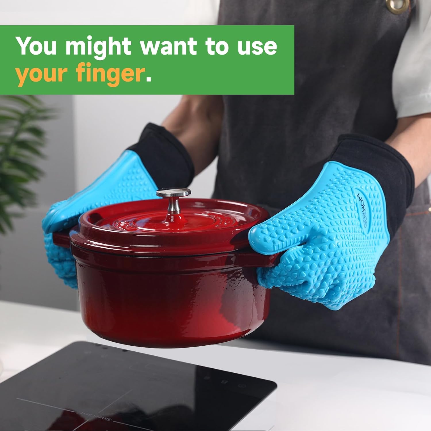 • Effortless Cleanup, Smarter Kitchen Flow: Waterproof silicone repels hot grease and marinade spills, while dishwasher-safe design erases stains in minutes; Hang the oven gloves compactly with the built-in loop—ideal for small kitchen spaces or tossing into camping gear without bulk
