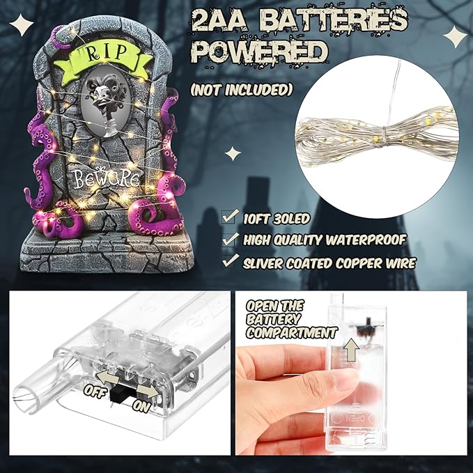 • Nighttime Availability: our Halloween decorations outdoor graveyards come with 6 pack 3-meter long warm white led copper wire light strings (batteries not included), each with 30 LED lights; The exterior is waterproof, and the copper wire inside has good conductivity, which can be shaped and easily wrapped around the tombstone