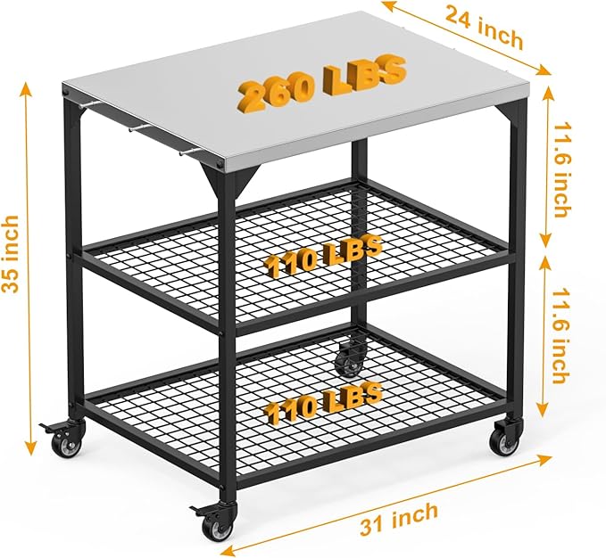• Large Storage Space: This grill table has three shelves to provide you with plenty of storage space and work area. Plus it features a grid design that prevents dust and moisture buildup and allows for quick drying of kitchen utensils.Installed Dimension:31"L x 24"W x 35"H,comes with 1 grill cover