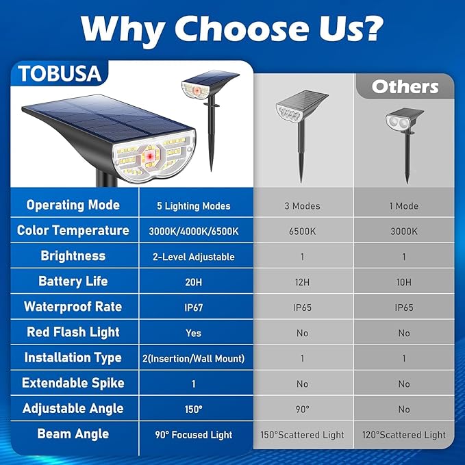 • ใ€๐Ÿฎ๐Ÿฌ๐Ÿฎ๐Ÿฐ ๐—จ๐—ฝ๐—ด๐—ฟ๐—ฎ๐—ฑ๐—ฒ๐—ฑ ๐—ฅ๐—ฒ๐—ฑ ๐—œ๐—ป๐—ฑ๐—ถ๐—ฐ๐—ฎ๐˜๐—ผ๐—ฟ ๐—Ÿ๐—ถ๐—ด๐—ต๐˜ใ€‘ Driven by customer-oriented values, TOBUSA kindly set aside an indicator light at the middle for each led solar landscape spotlights. The light keeps flashing in red when the solar spot lights are under charging and auto off after charging completed. This smart design provides necessary convenience for our customer to track on the status of the solar battery