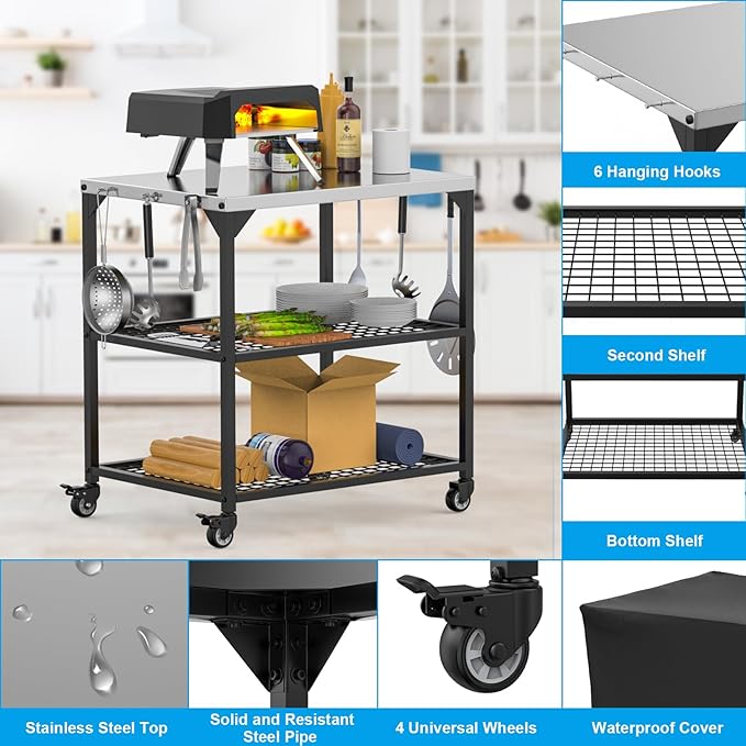 • 【Heavy Duty Construction】Dimension: 31"L x 24"W x 35"H. This heavy-duty steel pizza oven table cart is built to last, with a rugged powder-coated finish and a high-quality stainless steel tabletop that can handle high temperatures and heavy loads. Its four sturdy leg supports provide stability and durability, making it perfect for outdoor cooking and BBQ