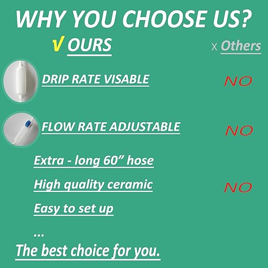 • 【How to use?】Soak the ceramic cone at least 15 minutes. Then insert the tube into the container filled with water at a high place. Pinch the drip pot and then block the water outlet in the ceramic cap. The tube will be in a vacuum state. Slowly release the drip pot and water will flow into tube due to pressure. Release the ceramic cap to let water flow out. Slide the regulator to adjut the water flow, then cover the cap on the soaked cone. Finally insert the ceramic cone into the soil.