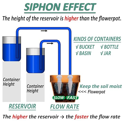 • 【How does it work?】This is a siphon effect. When you use the self watering plant insert, make sure the water level is higher than the soil. The water at a higher level flows to the potted plants at a lower level due to pressure. The ceramic cone will slowly seep water and keep the soil moist. What is different from other products is that we have added a controller and speed regulator to the hose, so you can adjust the water flow rate as needed to achieve the most desired flow rate.