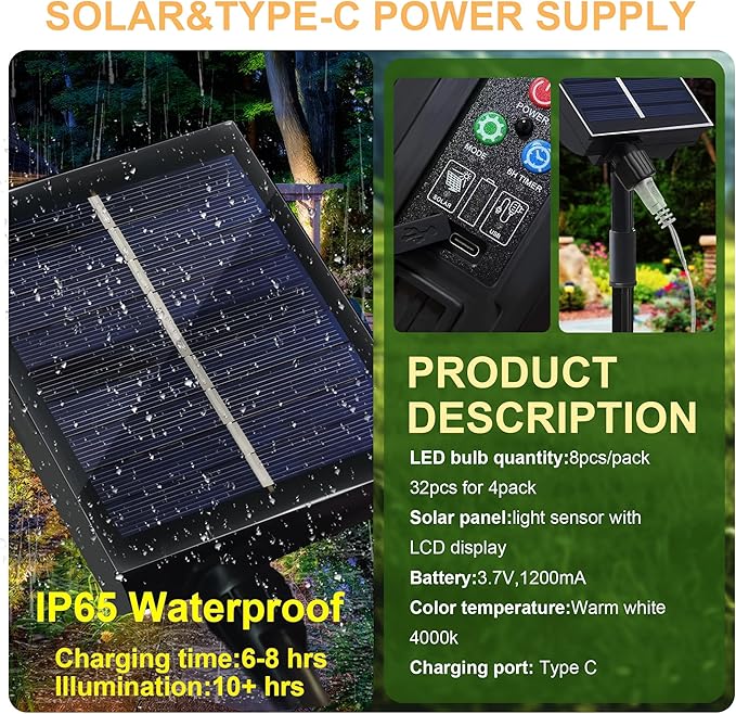 • 【EASY to USE and NO WIRES NEEDED】 Just attach the lights to the included metal ground stake, switch it to the "ON" position, and place it in a sunny spot. The solar panel will charge automatically, and the lights will illuminate at night. After 6-8 hours of charging, they can shine for 10+ hours