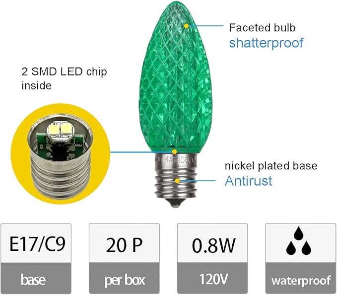 • 2 Pack C9 White LED Pathway Lights - MAINDECO C9 Christmas walkway lights are 30 feet long in total which contain 20 red and green C9 LED SMD strawberry faceted bulbs with 18 inches spacing, 20 Stakes, E17 base sockets. After installing the ground stakes, it can be fixed in the ground to add Christmas holiday lights to your yard, garden and pathway, etc.