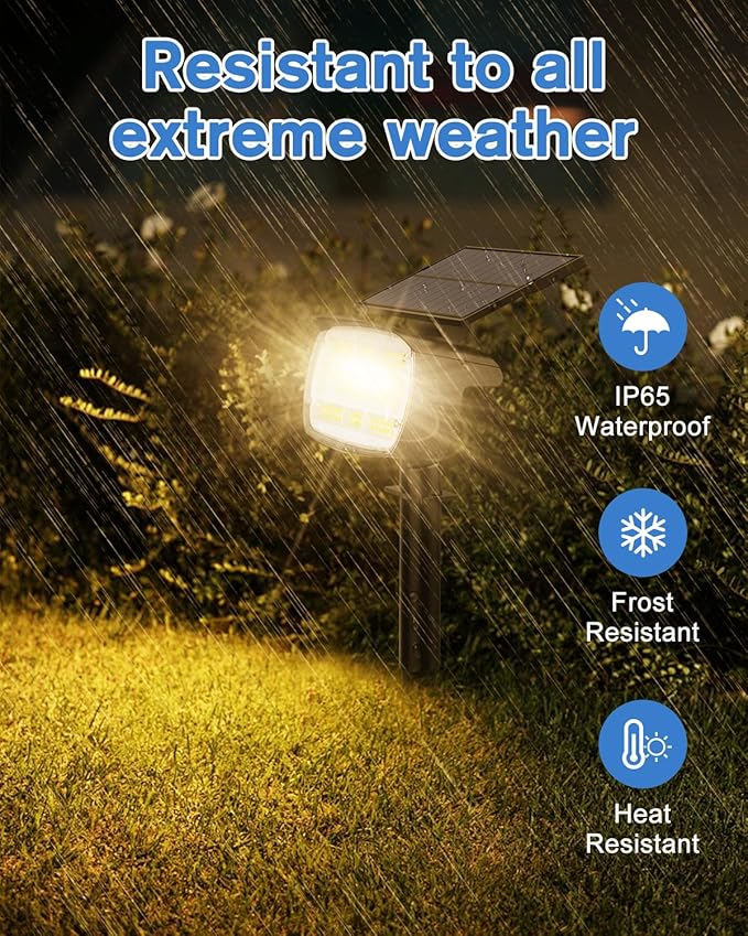 • 【Highly Efficient Charging】The outdoor solar lights for yard has the latest solar panels which can easily reach 30% energy conversion, and both spot lights' stick and solar panel can be rotated 120° for efficient energy conversion.