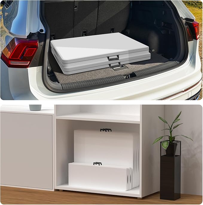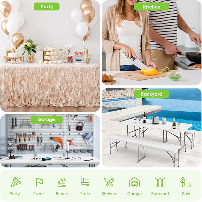 • Quality & Materials: This folding table 6 ft is made with high quality HDPE waterproof material, it has better durability and stability, the table legs are made of thickened steel pipes, can hold up to 300 pounds