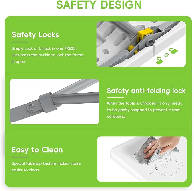 • Safe & Sturdy: This foldable table has two safety designed, one is safely anti-folding lock at the triangular bracket of the table leg, which can hold the table leg; The other is a safety lock on the back of the table top fold that secures the desktop