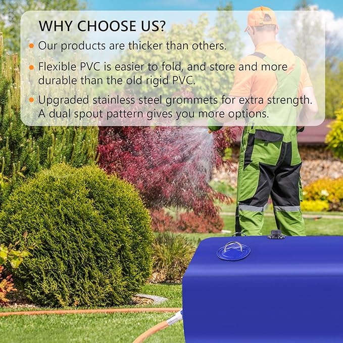 • THICK AND STRONG 1000d PVC MATERIAL: Our collapsible water containers are constructed with 1/20-inch-thick, high-density coated PVC mesh on both sides, with reinforced seams and high-frequency welded and embossed bonding to increase the strength and longevity of the bladder.