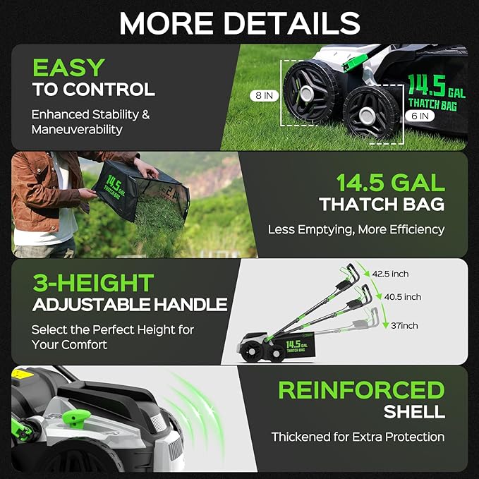 • RELIABLE AND CONVENIENT FEATURES: The scarifier and lawn dethatcher include a waterproof plug for safety, a cord clip for easy organization, and an extension cord holder to prevent tangling. It also features durable, wear-resistant wheels that ensure smooth movement, and a large 14.5-gallon removable collection bag for easy disposal of debris, reducing the need for frequent emptying. These practical features make lawn care more effortless and efficient
