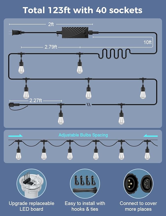 • Shatterproof and IP65 Waterproof: LED bulbs are made from durable plastic, resistant to accidental drops and bumps. This outdoor string lights waterproof ensures both lights and adapter fit for outdoor use, and last with a 30,000-hour lifespan