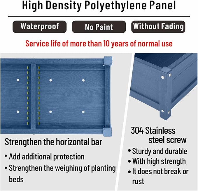 • Safety:Raised planter box outdoor made from HDPE,with no water or oil-based coatings, ensuring that your fruits, vegetables, plants, and herbs grow safely