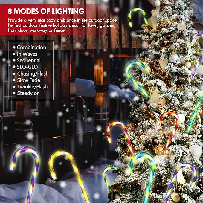 • 【Larger Size Christmas Candy Cane Lights -21 Inches】 With a total length of 21 inches including the stake, these candy cane lights are larger and taller than other products on the market. The set includes 10 candy cane lights, making installation easier. Some sellers claim to offer a 10-pack, but they require connecting 2 sets of 5 candy canes together, which can be unsafe and inconvenient. Our 10-pack with 8 lighting modes provides flickering and decorative lights, saving you time and effort.