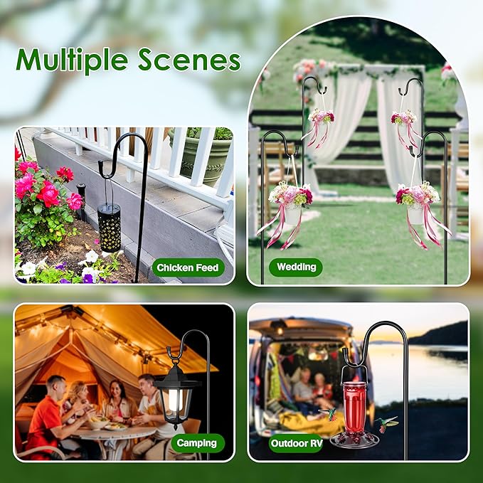 • Effortless Setup and Installation:Setting up your Shepherd's Hooks is a breeze. Simply stake them into the ground, and they are ready to hold your favorite garden decorations, bird feeders, or lighting fixtures, allowing you to transform your space in minutes.