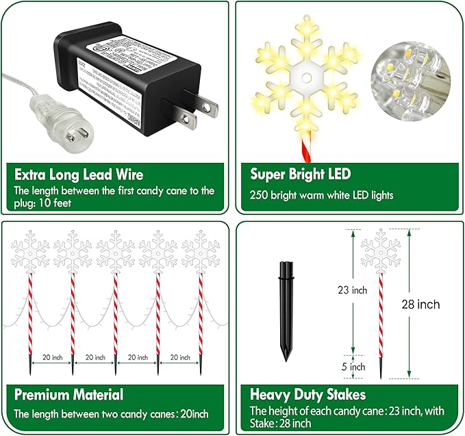 • 【28 Inch New Design Outdoor Christmas Snowflake Lights with Light Strings】 This is a upgraded Christmas light featuring large snowflake shapes above the candy canes. Each light is connected by light strips in between, each interval has 10 LED, more LED, super bright, add a romantic and cozy touch to your holiday display.