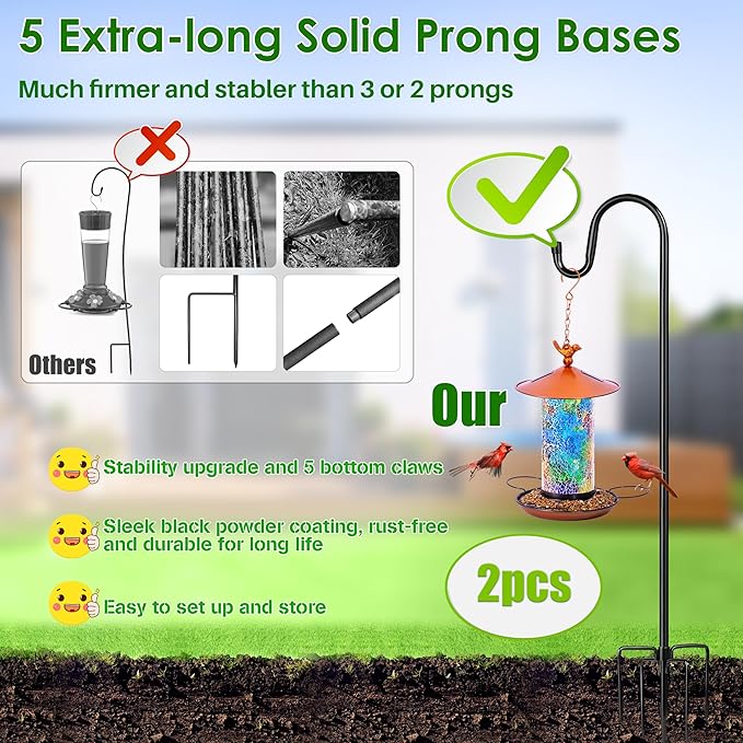 XDW-GIFTS Bird Feeder Pole for Outdoor, 2-Pack 45 Inch Shepherds Hooks Heavy Duty Garden Pole for Hanging Plant Basket, Solar Light Lanterns, Garden Plant Hanger Stands with 5 Base Prongs