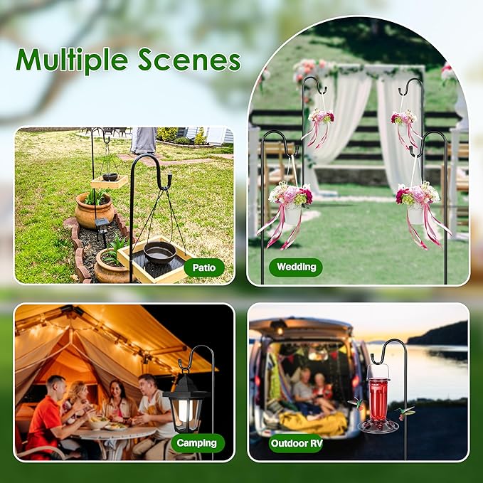 • Effortless Setup and Installation: Setting up your Shepherd's Hooks is a breeze. Simply stake them into the ground, and they are ready to hold your favorite garden decorations, bird feeders, or lighting fixtures, allowing you to transform your space in minutes.