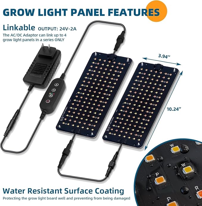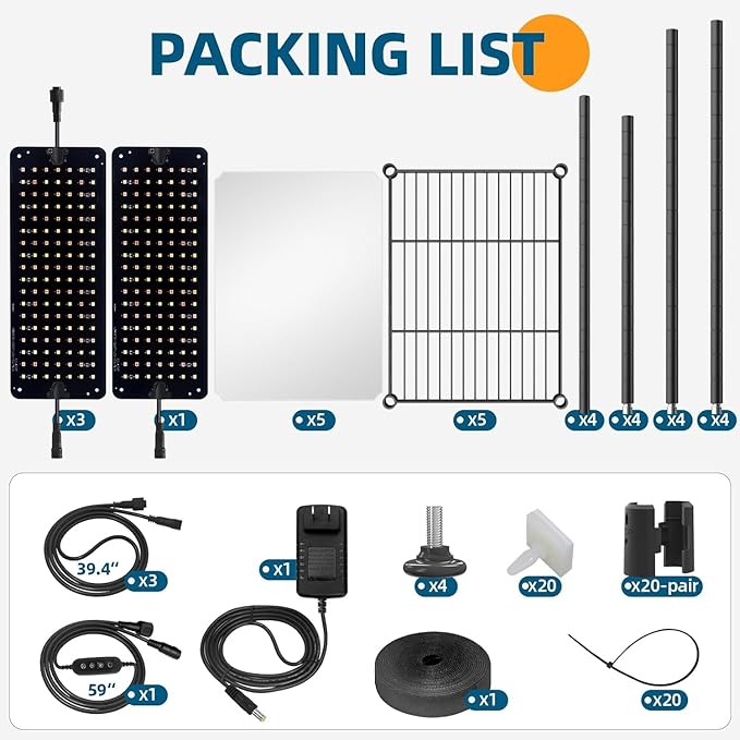 • What You Get: 4 x Barrina Grow Light Panel, 1 x AC/DC Adaptor, 1 x Power Cord with Turn On/Off Timer, 3 x Connecting Cord, 1 x Hook and Loop Tape, 20 x Snap-in Adhesive, 20 x Cable Tie, 5 x wire shelf, 5 x PP pad, 1 x Accessory Kit for Plant Shelf, 1 x Installation Manual