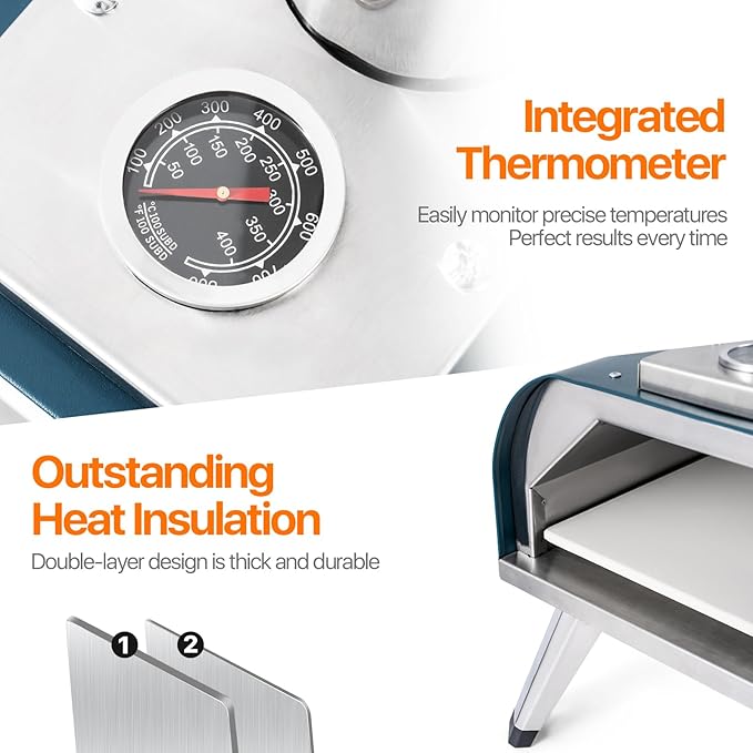 • Done in Minutes: Our outdoor pizza oven has a built-in thermometer so you can easily monitor the temperature inside the oven to track cooking progress. Heats up to 752°F in just 15 minutes and reaches a maximum temperature of 1,022°F. When preheated, the 13'' cordierite pizza stone bakes pizzas to crispy perfection in 90 seconds or less, as well as steaks, fish, lamb chops, burgers, salmon, vegetables and more